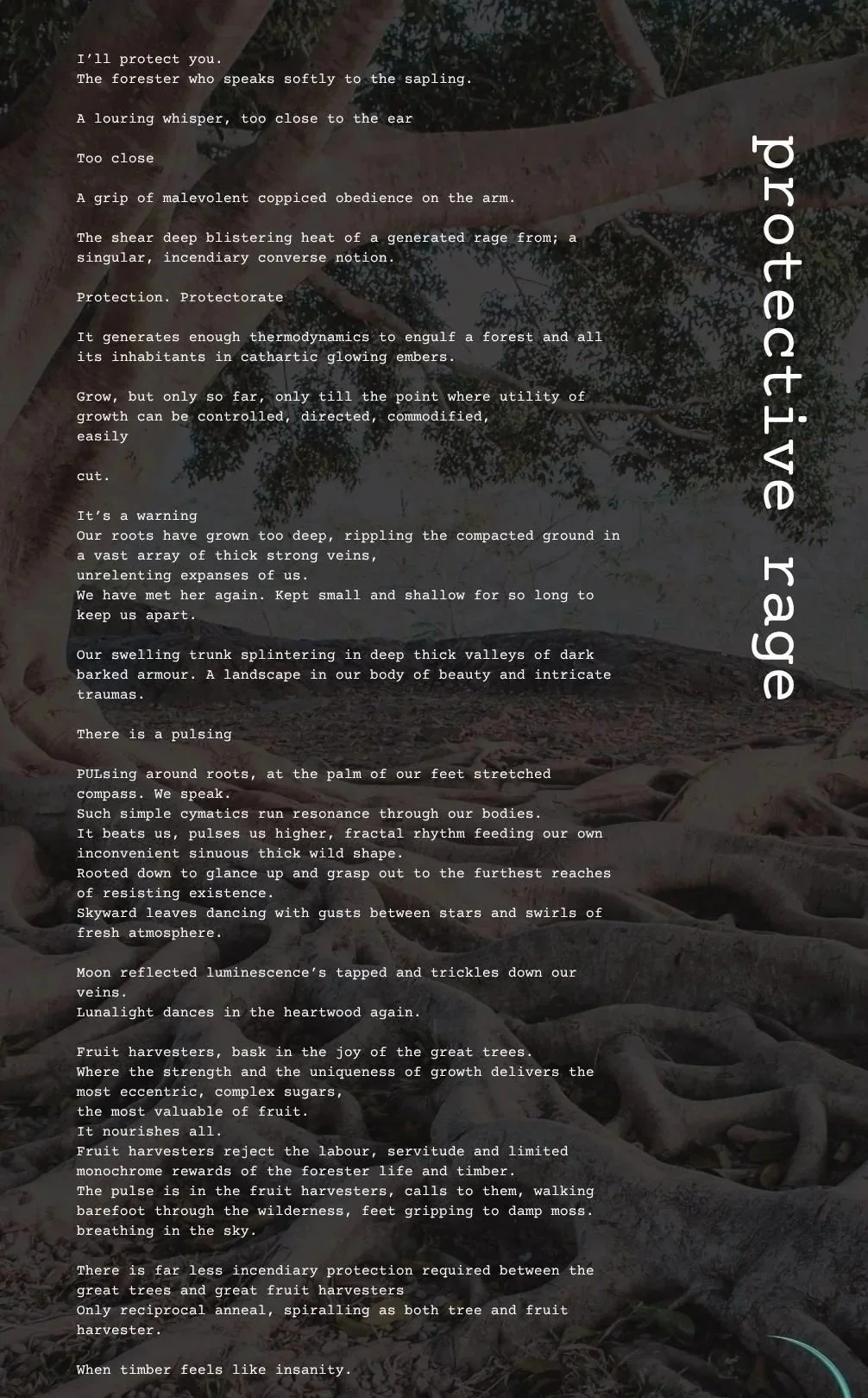 Our swelling trunk splintering in deep thick valleys of dark barked armour. A landscape in our body of beauty and intricate traumas.
